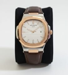 Two-Tone Rose Gold & Steel Integrated Sports Watch – White Dial & Brown Leather Strap